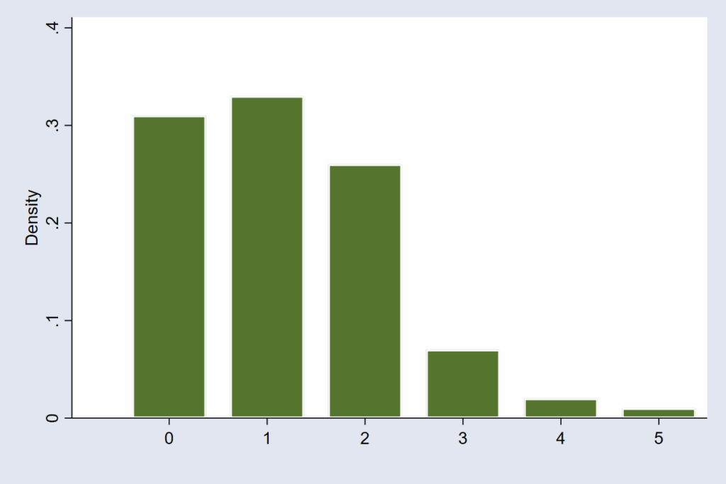 And when the model deals with counts — the number of hospital visits, crimes, or accidents per hour — the error structure follows the Poisson distribution. This distribution imagines that random events happen independently but at an average rate. It handles the fact that count data are whole numbers and can’t be negative (see figure 4).